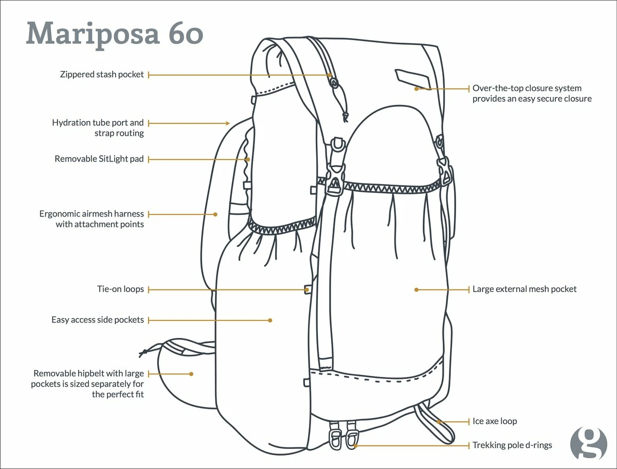 I love the feel of the Gossamer gear Mariposa on my longer hikes. It just feels so nice and tight on my body, making scrambling surprisingly easy with such a large bag. I rarely lose my balance because of my backpack sliding back and forth with the Mariposa on my back. I also like being able to glide into camp with a ready to go sitpad that I just pull out from outside of the backpack. The large side pocket means I can easily store my tent on the outside as well as a water bottle and other such goodness.